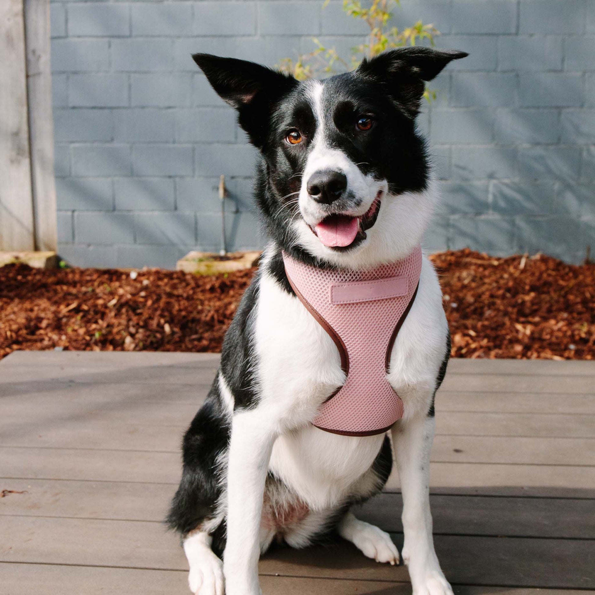 - Our blush pink dog harness is made from breathable, easy to care material with a dark brown vegan leather trim