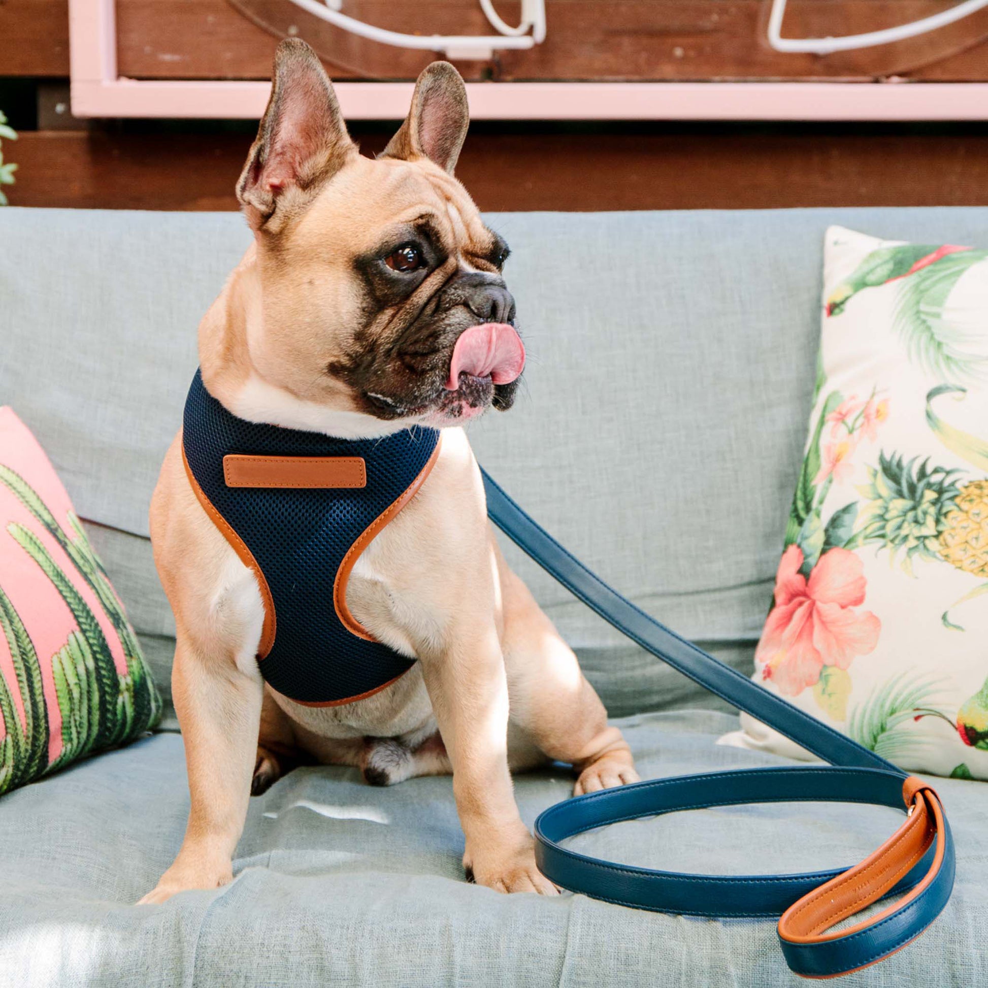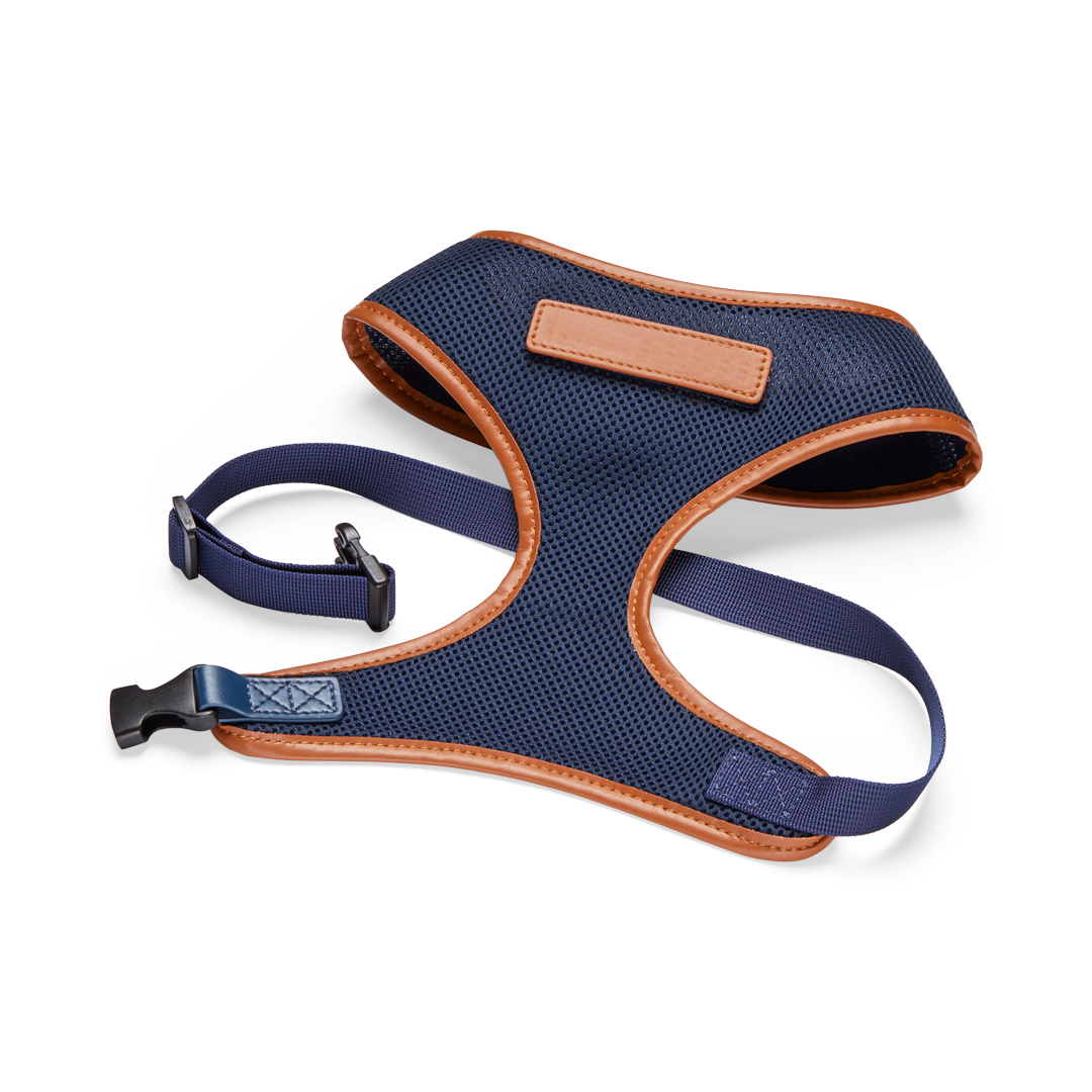 - Our navy dog harness is made from breathable, easy to care material with a tan vegan leather trim