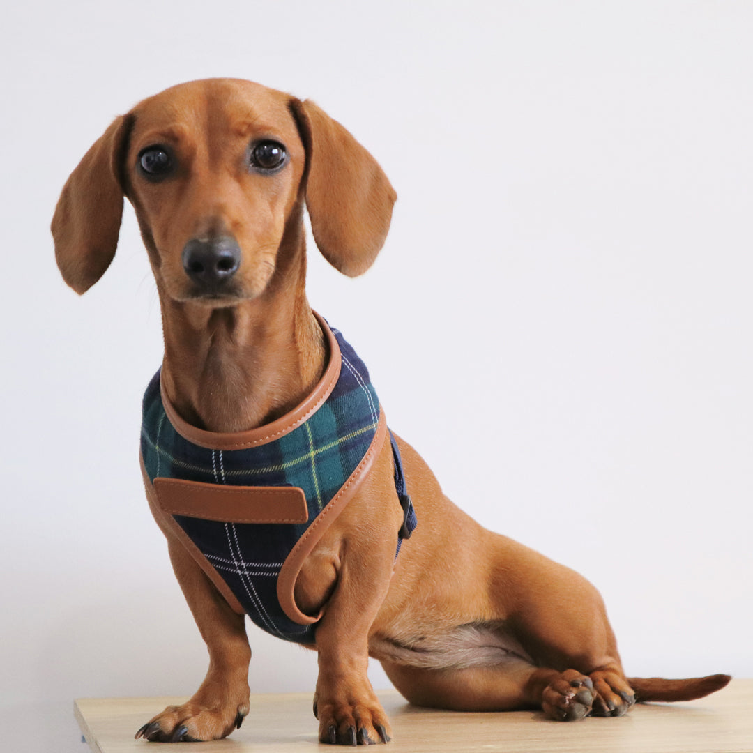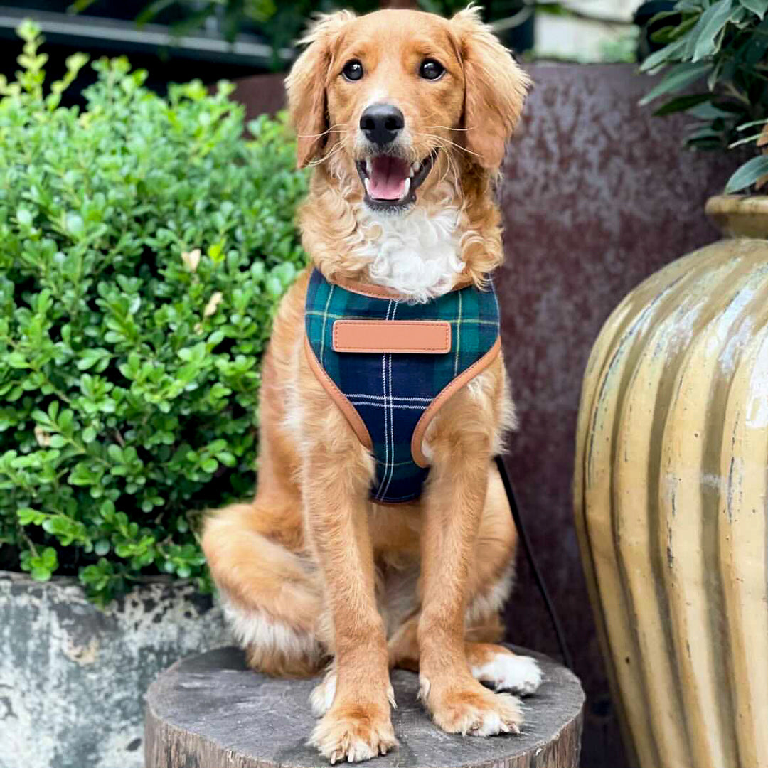 - Our Navy & Green Tartan Dog Harness is made from 100% cotton tartan fabric with a breathable soft mesh lining and stylish vegan leather tan trim