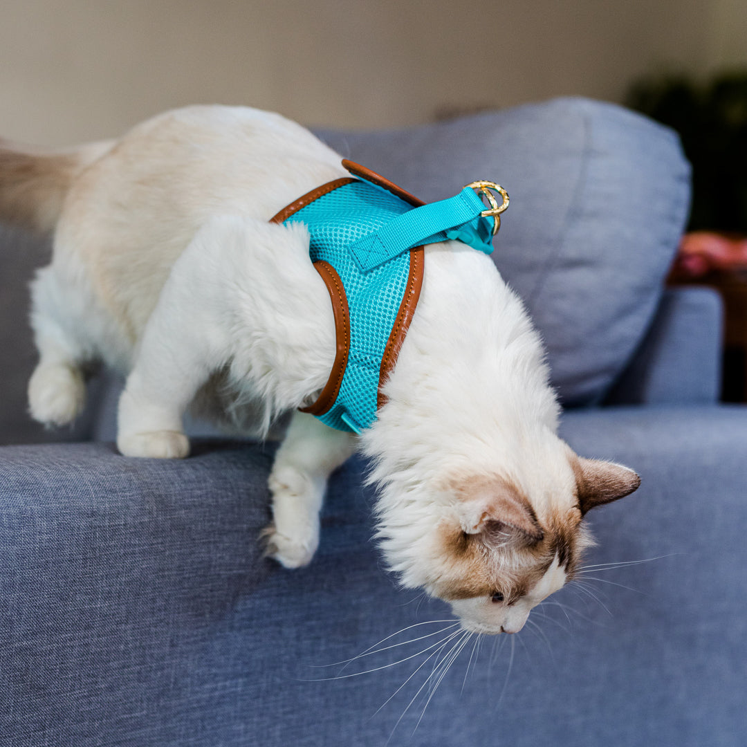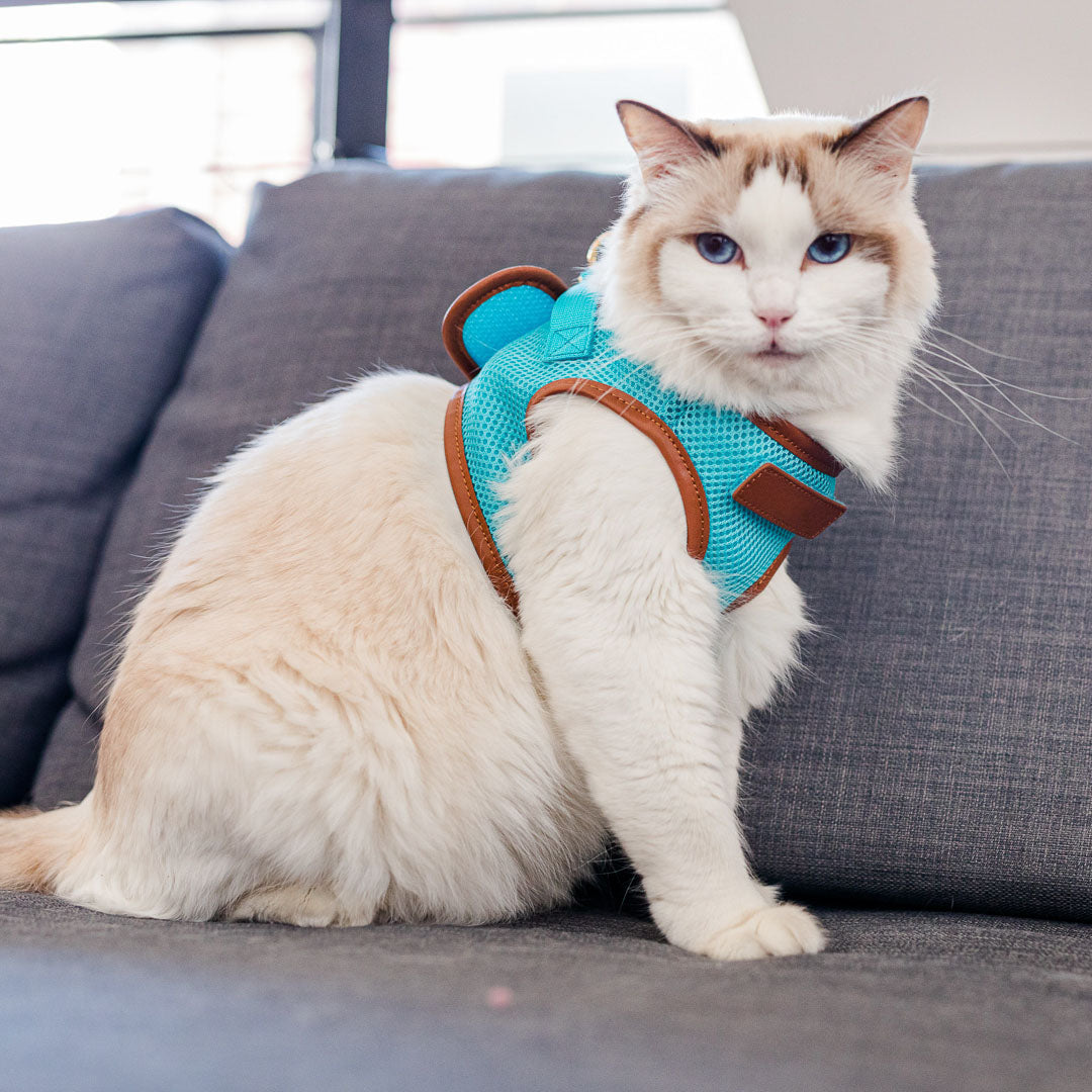 - Our sky blue cat harness is a step in harness with a Velcro and buckle clip fastening with a lead attachment on the back